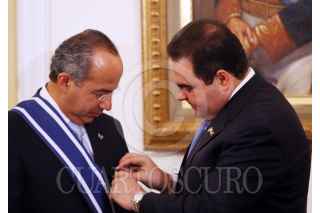 SAN SALVADOR, REPUBLICA DE EL SALVADOR., 04 MARZO 2008.-El presidente Felipe Calderon , durante la cena en su honor que ofreció Antonio Elias Saca Presidente de El Salvador donde el presidente Mexicano fué condecorado con la orden José Matias en el grado de la gran cruz placa de oro FOTO : ALFREDO GUERRERO/CUARTOSCURO.COM