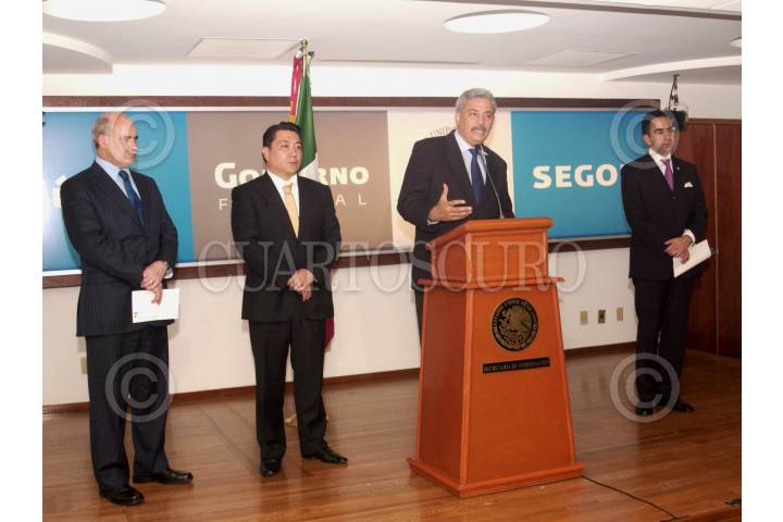 MÉXICO, D.F., 06MARZO2008.- Los secretarios de Agricultura, Ganadería, Desarrollo Rural, Pesca y Alimentación, Alberto Cárdenas Jiménez; del Trabajo y Previsión Social, Javier Lozano Alarcón; de Economía, Eduardo Sojo; y el subsecretario de gobierno de la Segob, Abraham González, ofrecieron una conferencia de prensa esta tarde en la sala de prensa de la Secretaría de Gobernación. FOTO: CUARTOSCURO.COM