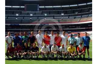 MÉXICO, D.F., 13MARZO2008.- Pilotos que participarán en la formula A1G, este fin de semana sostuvieron una cascarita con comentaristas de deportes en la cancha del Estadio Azteca. FOTO: IVÁN MENDEZ/CUARTOSCURO.COM