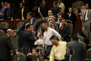 MÉXICO D.F.13MARZO2008.-Sesión ordinaria en la Cámara de Diputados donde se voto a favor para la conformación de la comision especial para investigar los contratos de PEMEX con particulares.En la imagen el diputado Ricardo Cantú (PT) dialoga con Javier Gónzalez Garza(PRD) durante la sesión. FOTO:GUILLERMO PEREA/CUARTOSCURO.COM
