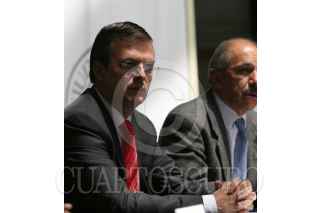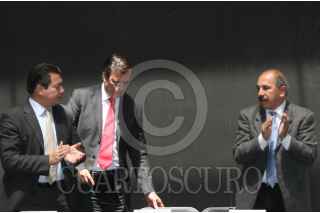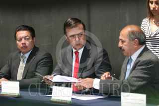 MÉXICO D.F. 19MARZO2008.-Marcelo Ebrad Casaubon jefe del gobierno capitalino, realizo la firma del Convenio para la Creación del Corredor Periférico que correra de Canal de Garay a el Toreo.En la imagen es acompañado por los secretarios de Finanzas, Mario Delgado Carrillo; de Transportes y Vialidad, Armando Quintero Martínez. FOTO: GUILLERMO PEREA/CUARTOSCURO.COM
