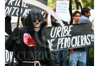 MÉXICO D.F., 27MARZO2008.- Familiares, activistas y simpatizantes de los cuatro estudiantes muertos durante un bombardeo de Colombia a un campamento de las FARC en Ecuador se manifestaron frente a la embajada colombiana en contra del presidente Álvaro Uribe. FOTO: ISAAC ESQUIVEL/CUARTOSCURO.COM