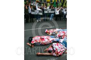 MÉXICO D.F., 27MARZO2008.- Familiares, activistas y simpatizantes de los cuatro estudiantes muertos durante un bombardeo de Colombia a un campamento de las FARC en Ecuador se manifestaron frente a la embajada colombiana en contra del presidente Álvaro Uribe. FOTO: ISAAC ESQUIVEL/CUARTOSCURO.COM