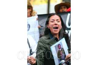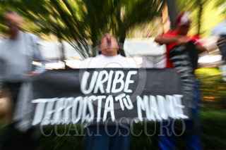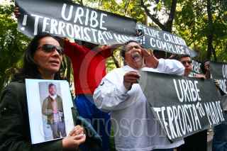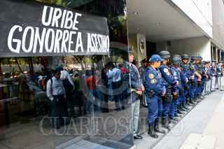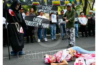 MÉXICO D.F., 27MARZO2008.- Familiares, activistas y simpatizantes de los cuatro estudiantes muertos durante un bombardeo de Colombia a un campamento de las FARC en Ecuador se manifestaron frente a la embajada colombiana en contra del presidente Álvaro Uribe. FOTO: ISAAC ESQUIVEL/CUARTOSCURO.COM