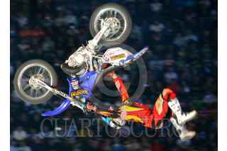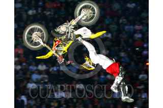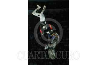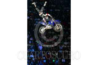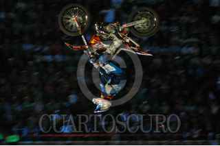 MÉXICO D.F., 04ABRIL2008.- El piloto suizo Mat Rebeaud salta con su motocicleta durante los Red Bull X Fighters que se realiza en la Plaza de Toros México. FOTO: RODOLFO ANGULO/CUARTOSCURO.COM