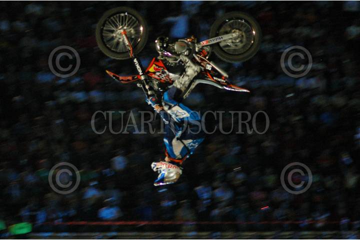 MÉXICO D.F., 04ABRIL2008.- El piloto suizo Mat Rebeaud salta con su motocicleta durante los Red Bull X Fighters que se realiza en la Plaza de Toros México. FOTO: RODOLFO ANGULO/CUARTOSCURO.COM
