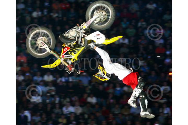 MÉXICO D.F., 04ABRIL2008.- El piloto suizo Mat Rebeaud salta con su motocicleta durante los Red Bull X Fighters que se realiza en la Plaza de Toros México. FOTO: RODOLFO ANGULO/CUARTOSCURO.COM
