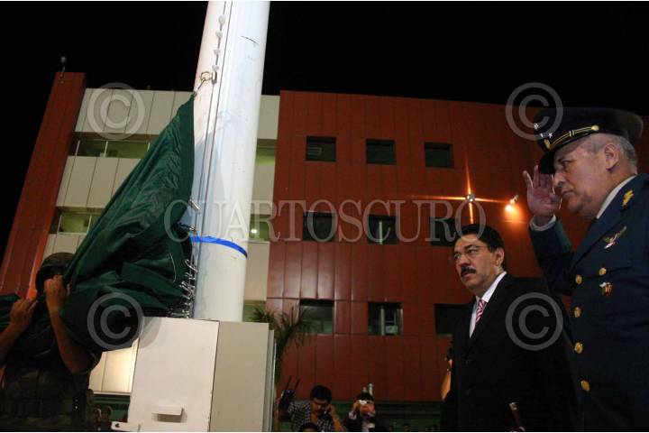 OAXACA, OAXACA, 04ABRIL2008.- El gobernador del estado Ulises Ruiz acompañado de su esposa Lourdes Salines inauguraron hoy la "Ciudad Administrativa" ubicada en la carretera Tule, asi mismo realizaron un rrecorrido por las instalaciones donde alzaron la bandera nacional. Cabe destacar que en el lugar, se desplegó un fuerte dispositivo de seguridad. FOTO: MAX NUÑEZ/CUARTOSCURO.COM