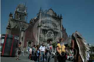 MÉXICO, D.F., 6ABRIL2008.- Capitalinos hacen fila frente catedral para resivir una limpia de los chamanes aztecas que por unas monedas quitan las malas vibras FOTO: RICARDO CASTELAN /CUARTOSCURO.COM,