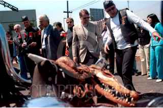 MEXDF31MAR2001: Jorge Castañeda Secretario de Relaciones Exteriores y Fernando Canales Clariond gobernador de Nuevo Leon dieron el banderazo para que un grupo de empresarios finlandeses aficionados al motociclismo realizen una gira por nuestro pais para promover inversiones. FOTO:Oswaldo Ramirez/CUARTOSCURO.COM