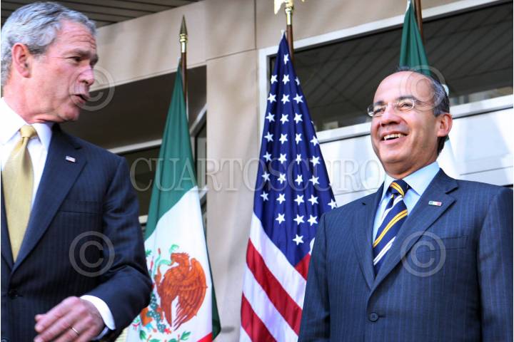 NUEVA ORLEANS, LUISIANA, 21ABRIL2008.- El presidente de México, Felipe Calderón Hinojosa, acompañado del presidente de Estados Unidos George W. Bush, durante la develación de la placa en la inauguración de la nueva sede del consulado de México en Nueva Orleans. FOTO: ALFREDO GUERRERO/CUARTOSCURO.COM