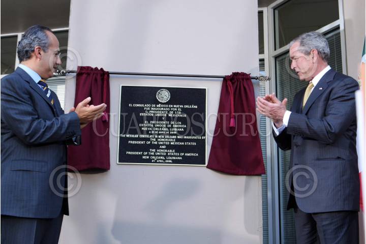 NUEVA ORLEANS, LUISIANA, 21ABRIL2008.- El presidente de México, Felipe Calderón Hinojosa, acompañado del presidente de Estados Unidos George W. Bush, durante la develación de la placa en la inauguración de la nueva sede del consulado de México en Nueva Orleans. FOTO: ALFREDO GUERRERO/CUARTOSCURO.COM
