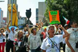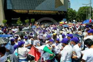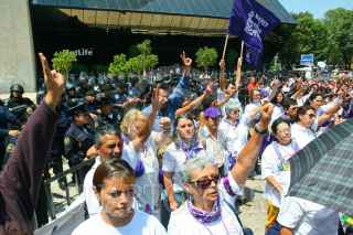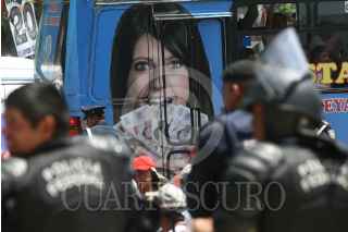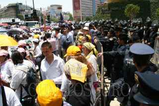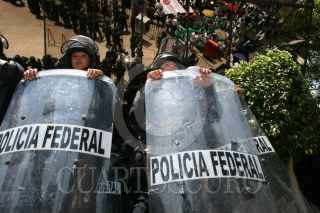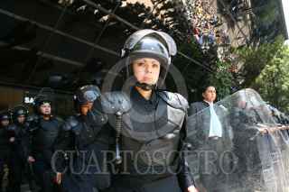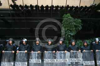 MÉXICO D.F., 21ABRIL2008.- Elementos dela Policia Federal Preventiva femenil resguardan las inmediaciones de torre caballito donde llegaron decenas de mujeres, llamadas "Adelitas", pertenecientes a la Resistencia Civil Pacífica en Defensa del Petróleo donde se manifestarna mientras Senadores sesionaban el el 5 piso de la torre. FOTO: SASHENKA GUTIERREZ/CUARTOSCURO.COM