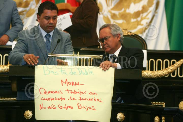 MÉXICO D.F., 22ABRIL2008.- Los diputados perredistas Ramon Lopez Jimenez acompañado por Carlos Miron durante la toma de tribuna en la Asamblea de Representantes FOTO: SÁSHENKA GUTIERREZ/CUARTOSCURO.COM