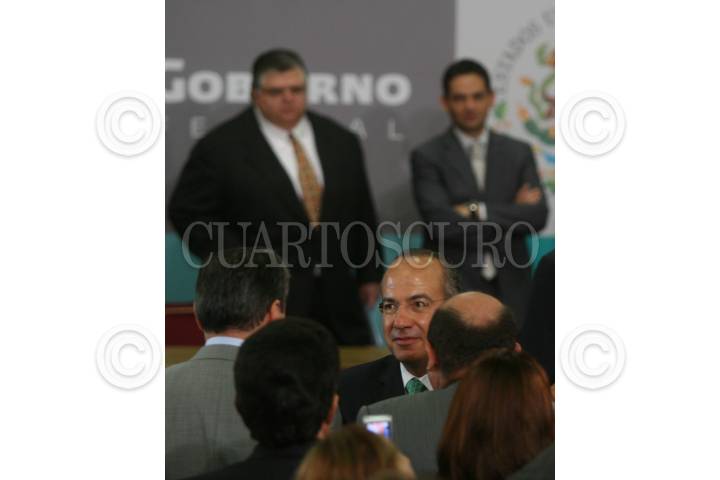 MÉXICO, D.F., 06MAYO2008.- Felipe Calderón Hinojosa Presidente de México, sale delm salon Adolfo Lopez Mateos de la residencia Oficial de los Pinos donde se firmó el decreto promulgatorio de la reforma constitucional en materia de gasto público y fiscalización, mientras Agustin Carstens Secretario de Hacienda y Juan Camilo Mouriño Secretario de Gobernacion Observan. FOTO: SÁSHENKA GUTIÉRREZ/CUARTOSCURO.COM