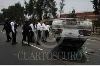 MÉXICO, D.F., 07MAYO2008.- Comerciantes del mercado ambulante de "El Salado" voltearon una patrulla sobre la calzada Ignacio Zaragoza, tras un operativo para decomisar, ropa de contrabando. FOTO: IVAN MENDEZ/CUARTOSCURO.COM
