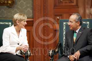 MEXICO D.F., 08MAYO2008. El Presidente de la Republica Felipe Calderòn Hinojosa durante la ceremonia de presentaciòn de cartas credenciales dela Excelentisima Embajadora Extraordinaria y Plenipotenciaria de la comunidad de Australia, Señora, Katrina Anne Cooper que se llebo acabo en el salòn de embajadores en Palacio Nacional. FOTO ARIEL GUTIERREZ/CUARTOSCURO.COM