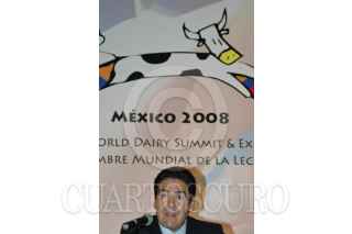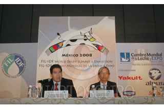 MÉXICO, D.F., 08MAYO2008.- Armando Paredes Arroyo, presidente del comité oganizador y Toru Ogawa Osawa, presidente del FIL - IDF México ( International Dairy Federation) durante una conferencia de prensa en donde se dio a conocer la Cumbre Mundial de la Leche y la Expo México 2008. FOTO: RODOLFO ANGULO/CUARTOSCURO.COM