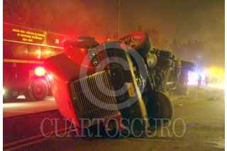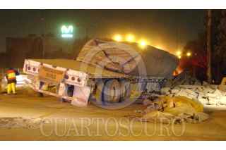 MÈXICO, D.F., 13MAYO2008. Esta madrugada un trailer con doble plataforma que transportaba costales de cemento, volco sobre el periferico a la altura de la avenida Conscripto con direcciòn al sur provocando un enorme caos vehicular. FOTO:LUZ ACEVEDO/CUARTOSCURO.COM