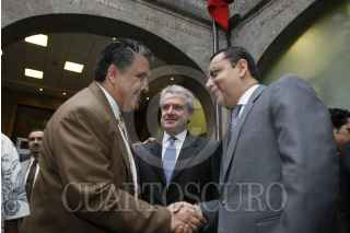 MÉXICO, D.F., 13MAYO2008.- Guadalupe Acosta Naranjo Presidente interino del PRD saluda a German Martínez dirigente Nacional del PAN , mientras Santiago Creel Miranda Presidente de la Mesa directiva del Senado de la República observa durante el debate acerca de los lineamientos que deben incluirse en la Reforma Energética en el Senado de la República. FOTO: IGNACIO GONZALEZ/CUARTOSCURO.COM
