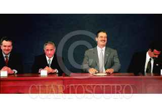 Santiago Creel, Joel Ayala, Vicente Fox y Carlos Abascal en la ceremonia de clausura del XIX Congreso Nacional Ordinario de la Federación de Sindicatos de Trabajadores al Servicio del Estado (FSTSE), en la residencia oficial de los Pinos. FOTO: Victoria Valtierra/CUARTOSCURO.COM