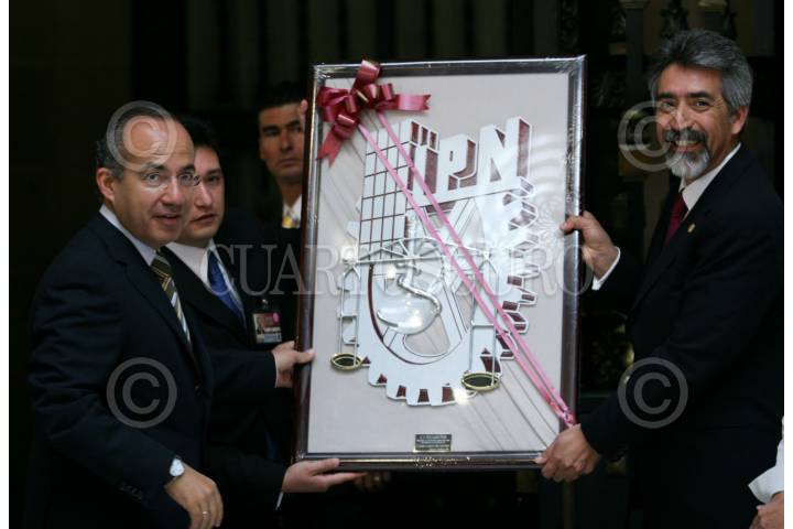 MÉXICO, 21MAYO2008.- José Enrique Villa Rivera, director general del IPN y Felipe Calderón Hinojosa, Presidente de México, durante la ceremonia del día del Politécnico y la entrega de la presea "Lázaro Cárdenas", que se realizó en el Palacio Nacional. FOTO: MOISÉS PABLO/CUARTOSCURO.COM