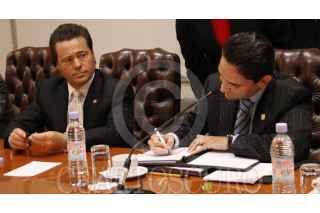 MÉXICO, D.F., 22MAYO2008.- Juan Camilo Mouriño, Secretario de Gobernación, encabezó la firma de los acuerdos en materia de desarrollo social y agricultura que celebraron el gobierno federal y la Conferación Nacional de Gobernadores. En la imagen lo observa el Eduardo Bours, gobernador de Sonora. FOTO: NANCY JUÁREZ/CUARTOSCURO.COM