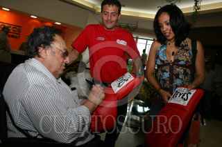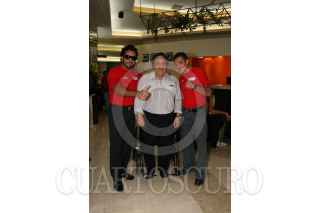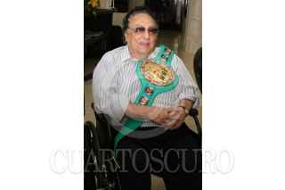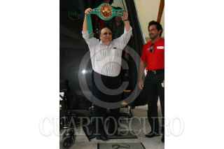 CHETUMAL, QUINTANA ROO, 27MAYO2008.- El Presidente del Consejo Mundial de Boxeo José Sulaiman Chagnón pone hasta arriba el cinturon con el que se pone en juego el campeonato mundial de peso plumada, lo cual es observado por el promotor boxistico Pepe Gomez. FOTO: MARCO POLO GUZMÁN HERNÁNDEZ/CUARTOSCURO.COM