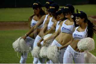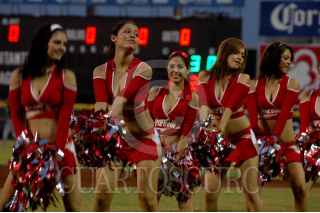 VERACRUZ, VERACRUZ, 27MAYO2008.- Guapas edecanes de conocida marca refresquera deleitan con su baile a los asistentes del estadio "Beto Ávila", donde el Águila de Veracruz se impuso cinco carreras a cuatro ante los Guerreros de Oaxaca en el primer juego de la serie. FOTO: JOSÉ CANDELARIO/CUARTOSCURO.COM