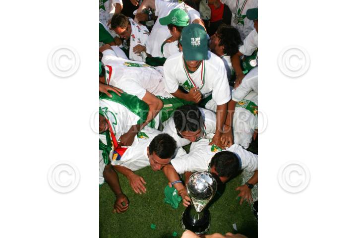 TORREON, COAHUILA 01JUNIO2008 .- Jugadores del equipo Santos celebra con la copa el haberse coronado como campeones del torneo de Clausura 2008, tras empatar en el partido de vuelta 1-1 (3-2 global) ante el Cruz Azul FOTO: SASHENKA GUTIERREZ/CUARTOSCURO.COM