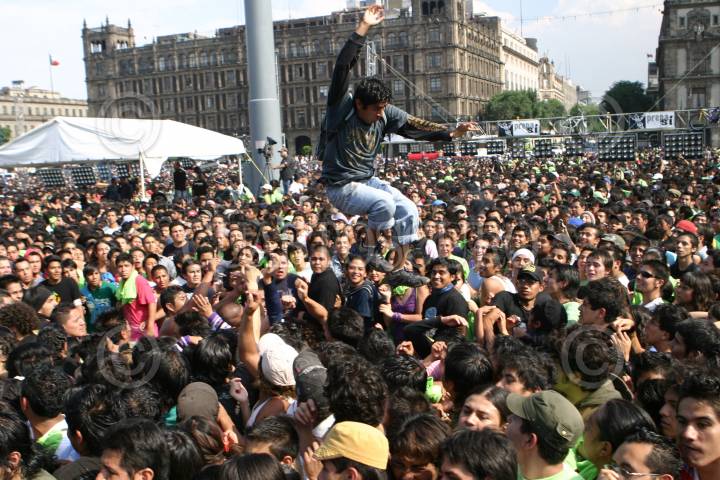 MÉXICO, D.F., 13JUNIO2008.- Un joven "vuela" por encima de las personas en el concierto Prepa Sí que organizo el Instituto de la Juventud en el Zócalo capitalino al cual asistieron cientos de jóvenes. FOTO: RODOLFO ANGULO/CUARTOSCURO.COM