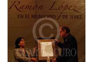 JEREZ, ZACATECAS, 20JUNIO2008.-El escritor veracruzano Francisco Hernández, recibió la medalla de posesía "Ramón López Velarde" de manos de la gobernadora de Amalia García Medina en una ceremonia realizada en el teatro Hinojosa. FOTO: CARLOS SEGURA/CUARTOSCURO.COM