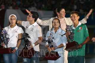 MÉXICO, D.F., 21JUNIO2008.- Los clavadistas olímpicos Paola Espinosa, Romel Pacheco, Tatiana Ortiz y German Sanchéz son acompañados de Ana Gabriela Guevara durante una exhibición en donde se les entrego un reconocimiento y que se realizo en la Alberca Olímpica. FOTO: RODOLFO ANGULO/CUARTOSCURO.COM