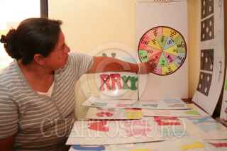 CHIMALHUACÁN, EDOMEX, 22JUNIO2008.- Las alfabetizadoras María Félix Romero y Dulce María Razo, oriundas del lugar, inventaron un método innovador de enseñanza con una serie de materiales didácticos diseñados por ellas mismas, lo que les ha permitido un mejor enseñanza a sus alumnos así como un mejor aprovechamiento por parte de ellos. El instrumento consiste en un disco de las trilíteras que al girarlo y hacer que los colores coincida forma palabras. FOTO: MARIO NULO/CUARTOSCURO.COM