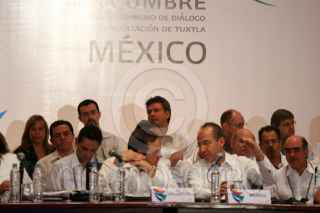 VILLAHERMOSA, TABASCO, 28JUNIO2008.- Juan Camilo Mouriño, Agustín Cartens, Eduardo Sojo y Luis Tellez, gabinete pilar del gobierno mexicano en la inauguración de la X Cumbre del Mecanismo de Diálogo y Concertación de Tuxtla México. FOTO: MARCO POLO GUZMÁN HERNÁNDEZ/CUARTOSCURO.COM
