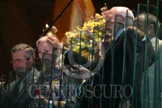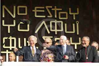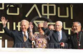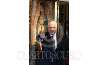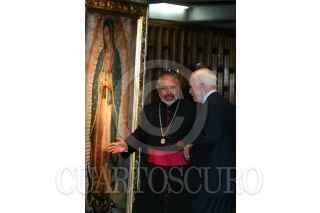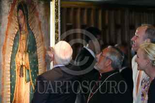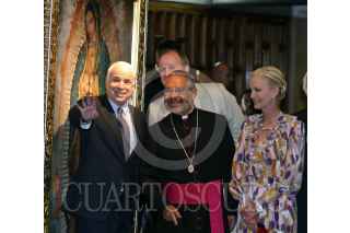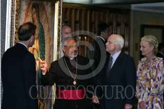 MÉXICO D.F., 03JULIO2008.- El réctor de la Basílica Diego Monroy dá una explicación del manto de la Virgen de Guadalupe al senador por Arizona y candidato a la presidencia de Estados Unidos por el partido Repúblicano John McCain que es acompañado de su esposa Cindy McCain durante un recorrido por la Basilica de Guadalupe. FOTO: RODOLFO ANGULO/CUARTOSCURO.COM