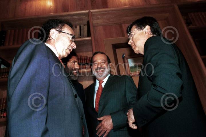El ex mandatario español Felipe González asistió a la presentación del libro " Comprender la Globalización" ; aquí en un breve intercambio de opiniones con el empresario Carlos Slim. FOTO: Oswaldo Ramirez/CUARTOSCURO.COM