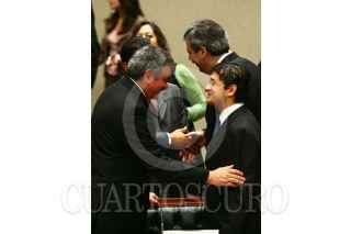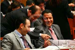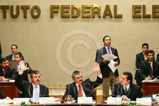 MÉXICO, D.F., 10JULIO2008.- El consejero Marco Antonio Baños Martínez, el diputado por Nueva Alianza Miguel Ángel Jiménez Godínez y el representante del PAN ante el IFE, Roberto Gil Zuarth, durante la sesión extraordinaria del Instituto. FOTO: ISAAC ESQUIVEL/CUARTOSCURO.COM