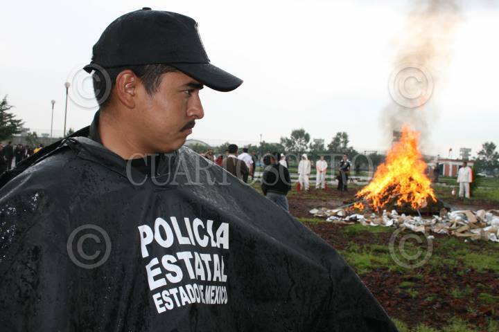 NEZAHUALCOYOTL, ESTADO DE MEXICO.- La Agencia de Seguridad Estatal en el Estado de México, quemo 340 kilogramos de marihuana que fue decomisada en distintos operativos en los municipios de la entidad, en la quema estuvo presente el Secretario de Gobierno del estado, Victor Humberto Benitez Treviño. FOTO:RICARDO CASTELAN/CUARTOSCURO.COM