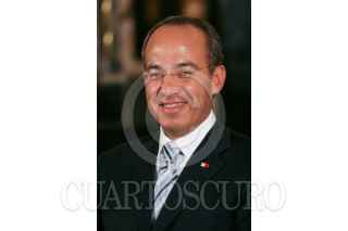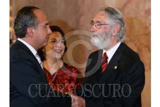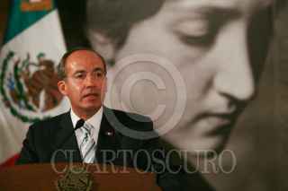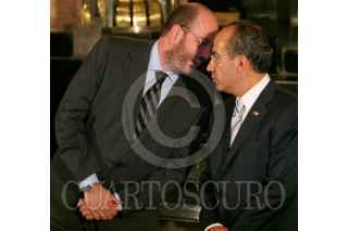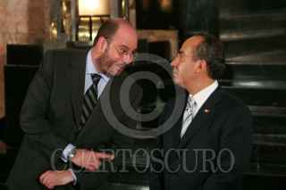 MÉXICO D.F., 17JULIO2008.- Felipe Calderón Hinojosa, Presidente de México y Donald Antonio Blair Rivas Mercado, hijo de Antonieta Rivas Mercado, durante la ceremonia de inauguración de la exposición "Antonieta Rivas Mercado" en el Palacio de Bellas Artes. FOTO: MOISÉS PABLO/CUARTOSCURO.COM