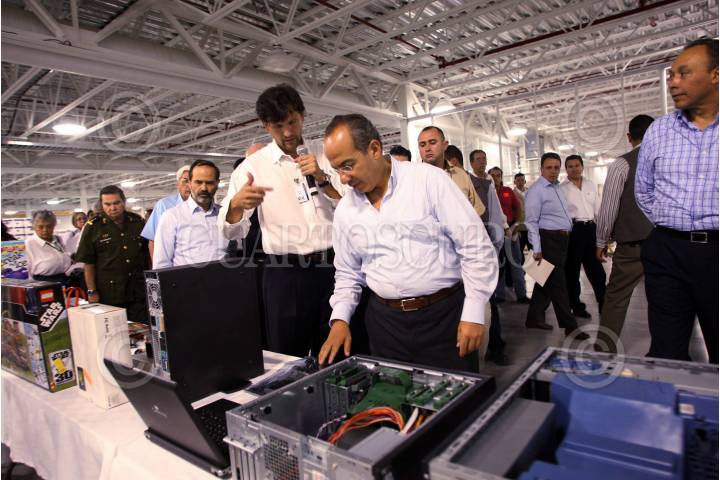 MUNICIPIO DE JUAREZ, CHIHUAHUA., 22 JULIO2008.- Felipe Calderon presidente de México, recorre la planta Flextronics, esta empresa esta dedicada a la fabricación de componentes electrónicos que provee, los productos OEM pueden ser tanto hardware como software, la compañía opera para atender diversos campos incluyendo cómputo, industrial, automotriz y de medicina. FOTO: ALFREDO GUERRERO/CUARTOSCURO.COM