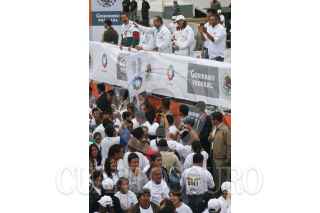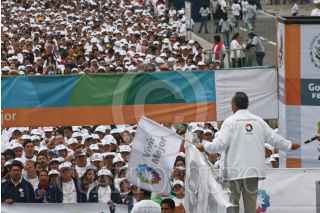 MÉXICO, D.F., 03AGOSTO2008.- El presidente Felipe Calderón llamó a "masificar" el deporte en el país para que todos lo practiquen, pues además de beneficiar a la salud es el "mejor instrumento" para alejar a niños y jóvenes del alcohol y de las drogas, en la imagen da el banderaso de salida para la caminata de la campaña. FOTO: RICARDO CASTELAN /CUARTOSCURO.COM