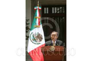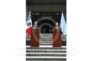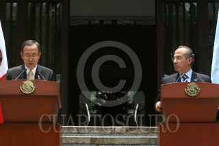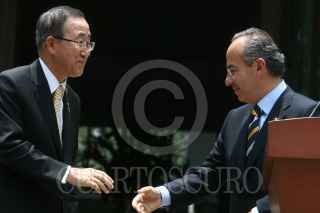 MÉXICO, D.F., 04AGOSTO2008.- Felipe Calderon Hinojosa Presidente de México, acompañado por Ban Ki Moon secretario general de las naciones unidas (ONU) durante el mensaje a los medios de comunicaciónque ofrecieron en las escalinatas de la residencia oficial de los pinos. FOTO: SÁSHENKA GUTIÉRREZ/CUARTOSCURO.COM