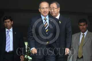 MÉXICO, D.F., 04AGOSTO2008.- Felipe Calderon Hinojosa Presidente de México, acompañado por Ban Ki Moon secretario general de las naciones unidas (ONU) durante el mensaje a los medios de comunicaciónque ofrecieron en las escalinatas de la residencia oficial de los pinos. FOTO: SÁSHENKA GUTIÉRREZ/CUARTOSCURO.COM