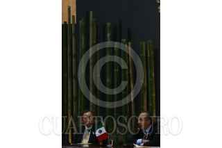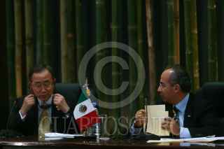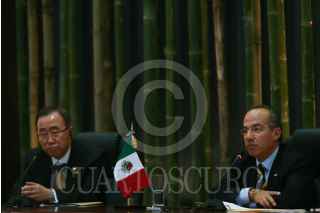 MÉXICO, D.F., 04AGOSTO2008.- Felipe Calderon Hinojosa Presidente de México, acompañado por Ban Ki Moon secretario general de las naciones unidas (ONU) durante la reunión de desarrollo del milenio y cambio climático realizada en el salon Adolfo Lopez Mateos de la residencia oficial de los Pinos. FOTO: SÁSHENKA GUTIÉRREZ/CUARTOSCURO.COM