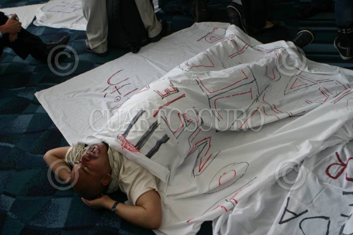 MÉXICO, D.F., 04AGOSTO2008.- Activistas protestan por no tener casa y ser enfermos de SIDA al termino de la conferencia magistral de William Clinton, ex presidente de los Estados Unidos dentro de las actividades de la Conferencia Internacional sobre el SIDA. FOTO: RODOLFO ANGULO/CUARTOSCURO.COM