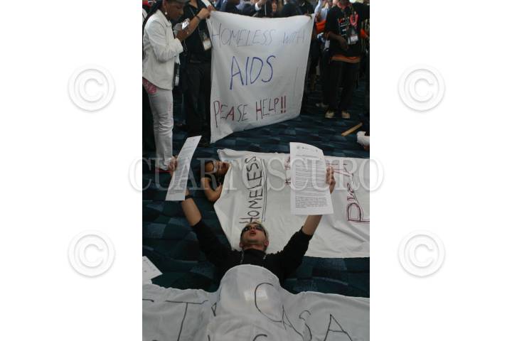 MÉXICO, D.F., 04AGOSTO2008.- Activistas protestan por no tener casa y ser enfermos de SIDA al termino de la conferencia magistral de William Clinton, ex presidente de los Estados Unidos dentro de las actividades de la Conferencia Internacional sobre el SIDA. FOTO: RODOLFO ANGULO/CUARTOSCURO.COM