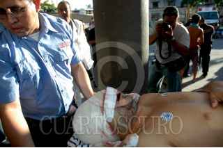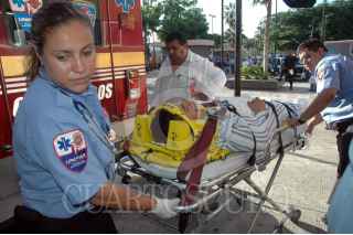 VERACRUZ, VERACRUZ. 04AGOSTO2008.- Fueron ingresados al área de urgencias del hospital general cuatro centroamericanos heridos en un tiroteo registrado esta madrugada en el municipio de Agua Dulce, al sur de la entidad. Donde dos ilegales murieron y otros treinta y cinco resultaron heridos, luego de que el camión tipo torton donde eran trasladados se impactara contra montículo debido a que venia siendo perseguido por policías municipales de este lugar ya que el conductor no había obedecido el alto que se le había marcado. Según la versión oficial indica que fueron el conductor y otras dos personas las que iniciaron el enfrentamiento a tiros por lo que repelieron la agresión con sus armas de cargo. Los ingresados al nosocomio son: Carlos Alberto García Zedillo de 21 años de origen salvadoreño delicado de salud al recibir un impacto de bala a la altura del ojo izquierdo, José Victoriano Hernández, hondureño de 40 años, Andrés Londoyo Cavales , colombiano de 20 años y Pablo Arellano Navarrete de 26 años sin identificar su nacionalidad estos tres últimos politraumatizados, debido a que los hospitales de la zona se vieron saturados, estos fueron trasladados vía aérea hasta esta ciudad. FOTO: JOSÉ CANDELARIO/CUARTOSCURO.COM