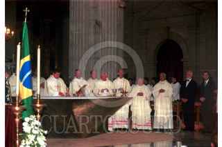En la homilía de este domingo, el cardenal Norberto Rivera, es acompañado por el arzobispo de la aparecida Brasileño Aloisio Lorscheider, y por el embajador de Brasil en México, Luiz Filipe de Macedo Suarez, en la entrega de la virgen aparecida. FOTO: David Bolaños/CUARTOSCURO.COM