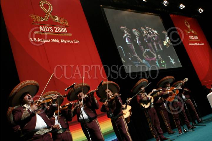 MÉXICO D.F., 08AGOSTO2008.- Al termino de la ceremonia de clausura de la XVII Conferencia Internacional sobre el SIDA que se realizo en el centro Banamex un grupo de marichi amenizo la salida de los asistentes. FOTO: RODOLFO ANGULO/CUARTOSCURO.COM